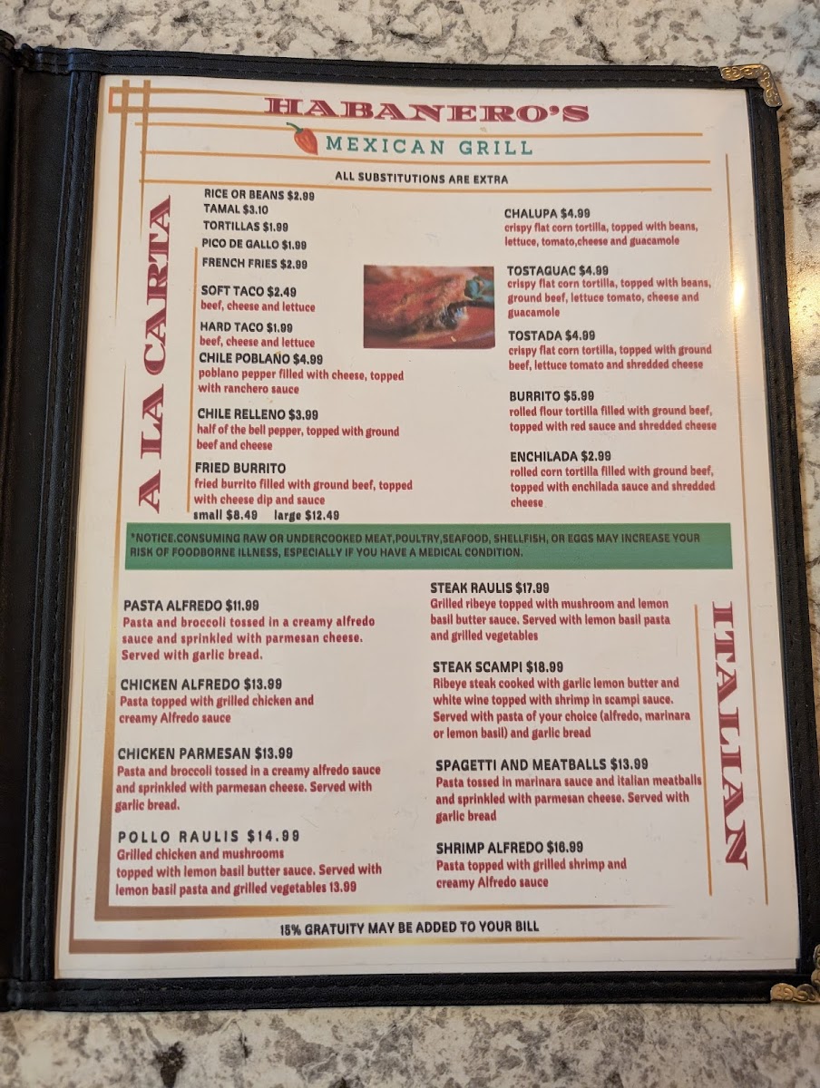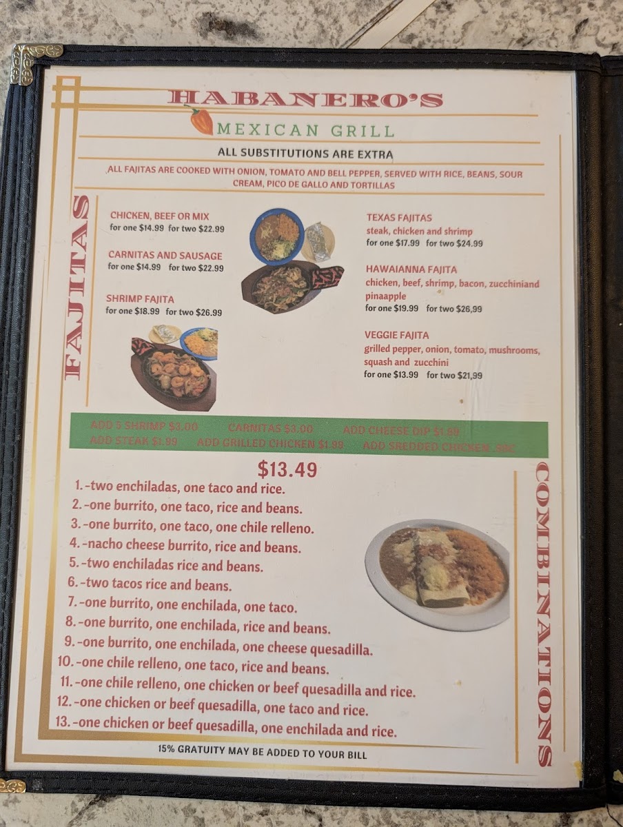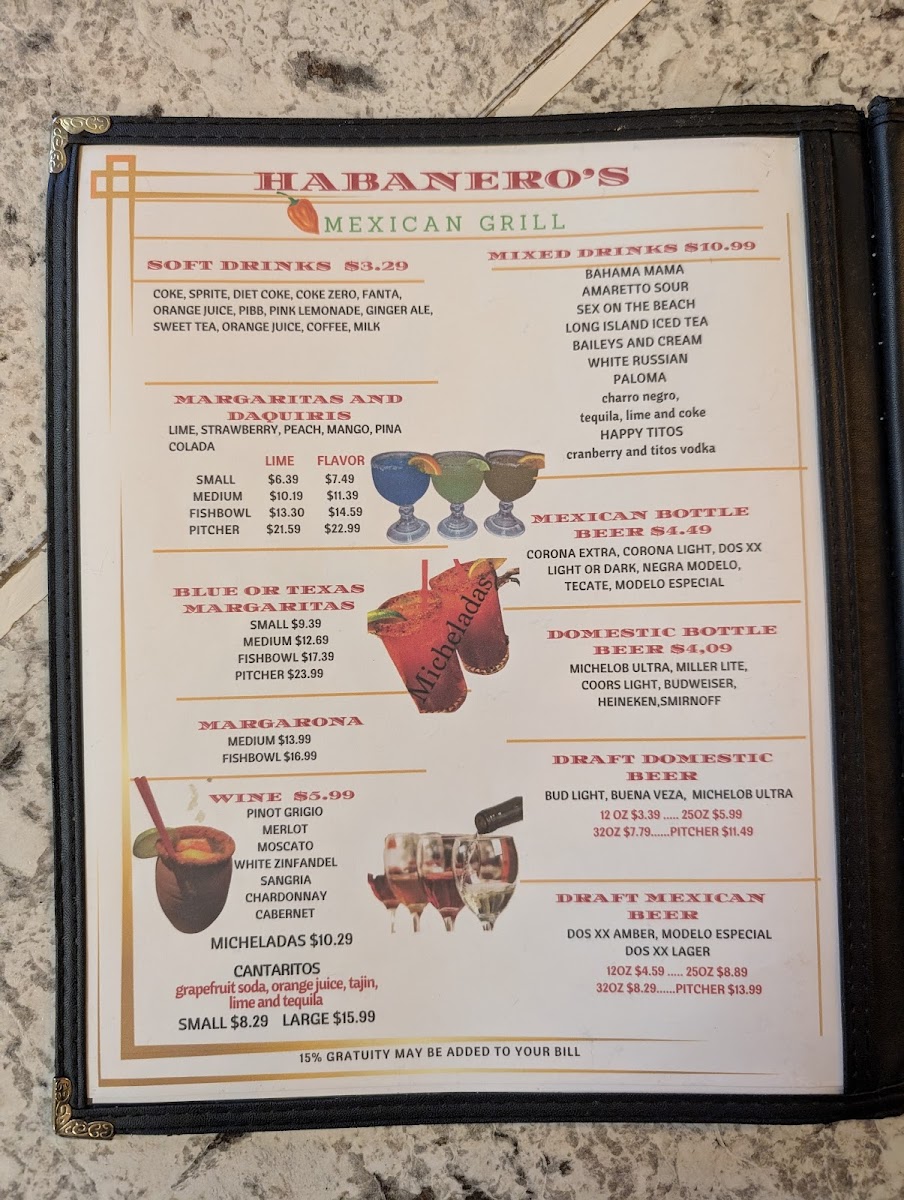 The menu at Habanero’s Mexican Grill offers a straightforward yet satisfying selection of classic Mexican dishes and comforting beverages. It’s the kind of menu that invites casual lunches and relaxed dinners, where familiar flavors and generous portions come together in a welcoming setting.